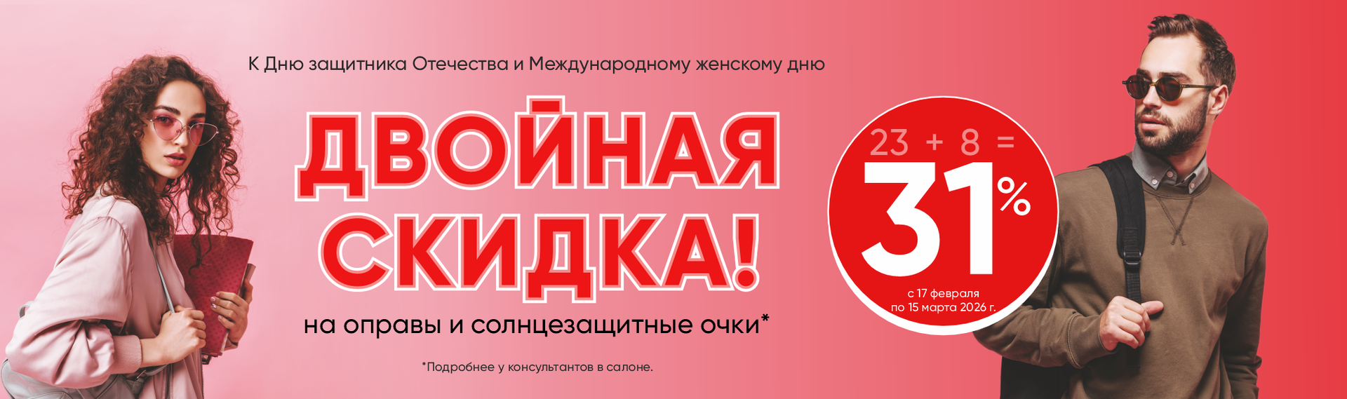 В «Конкор-Оптика» — двойная скидка к 23 Февраля и 8 Марта: минус 31% на оправы и солнцезащитные очки для него...